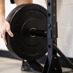 The Alpha1000 Squat Stand has the smallest footprint of all GRIND Fitness racks, but it packs in everything you need. The weight plate storage doubles as rack stabilizers, and the vertical barbell holder makes a great home for your favorite bar.