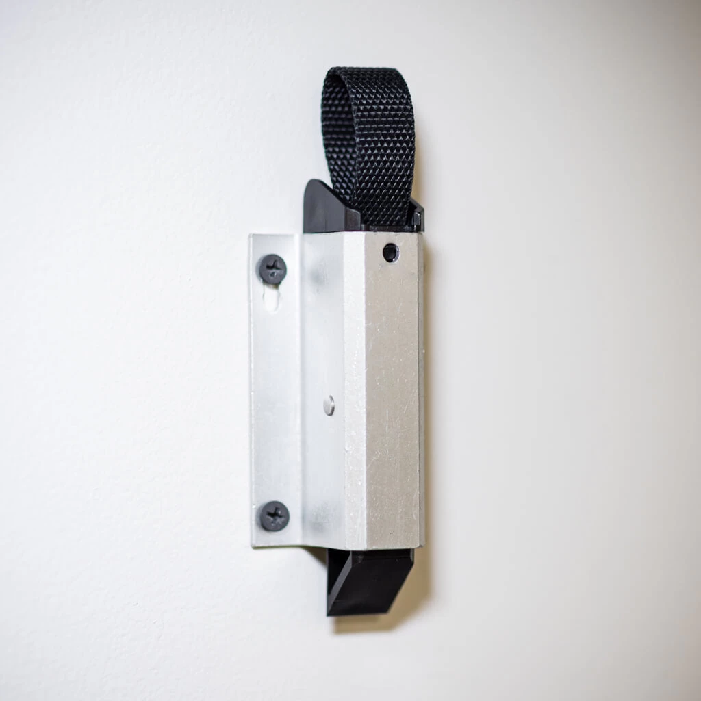 The Profile Bench Wall Lock is easy to install and use, and it doesn’t have stud requirements. When storing the bench, the lock automatically snaps onto the back plate of the bench. To unlock, simply pull up on the tether and deploy the bench.