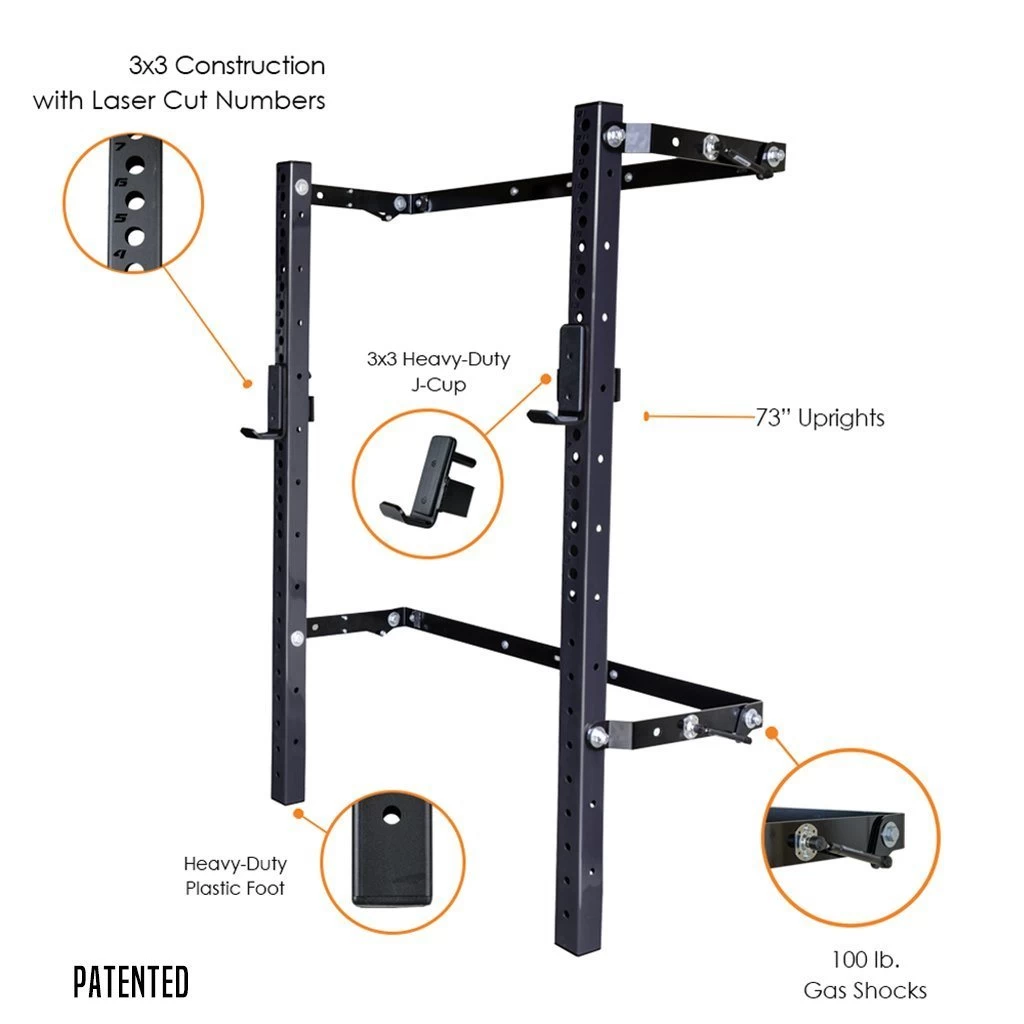 The patented wall-mounted Profile® PRO Folding Squat Rack is a sturdy and sleek way to start building your own garage or home gym.