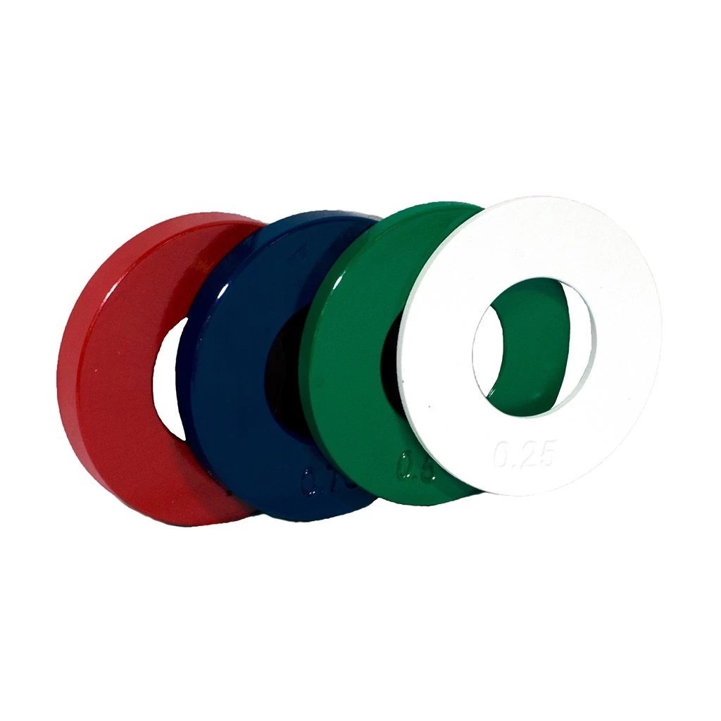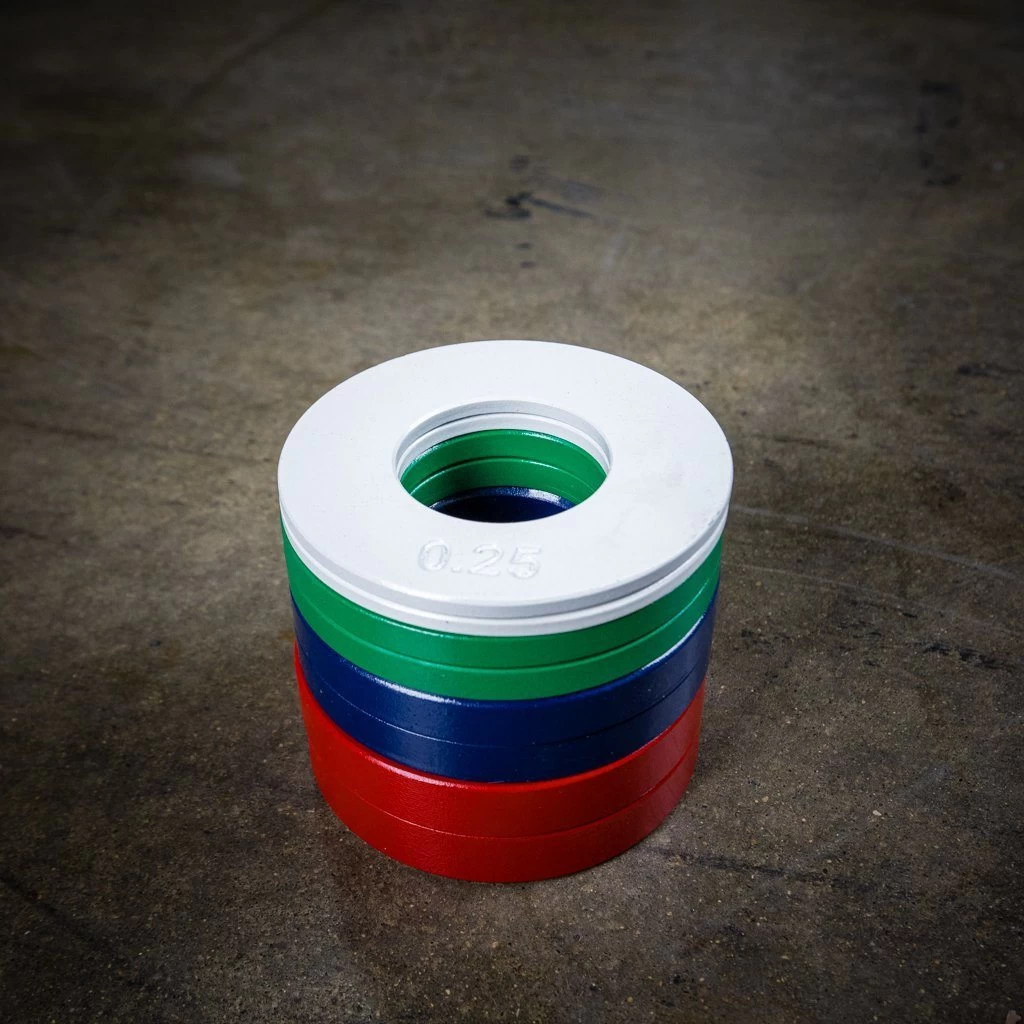 Weights are displayed in kilograms, and pairs are in matching colors for easy grabbing. With a 2″ collar opening, these fractionals fit all standard Olympic bars.